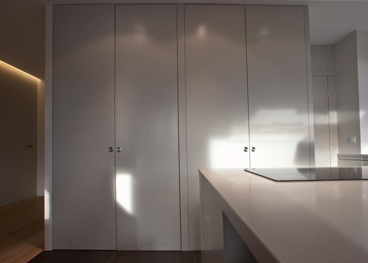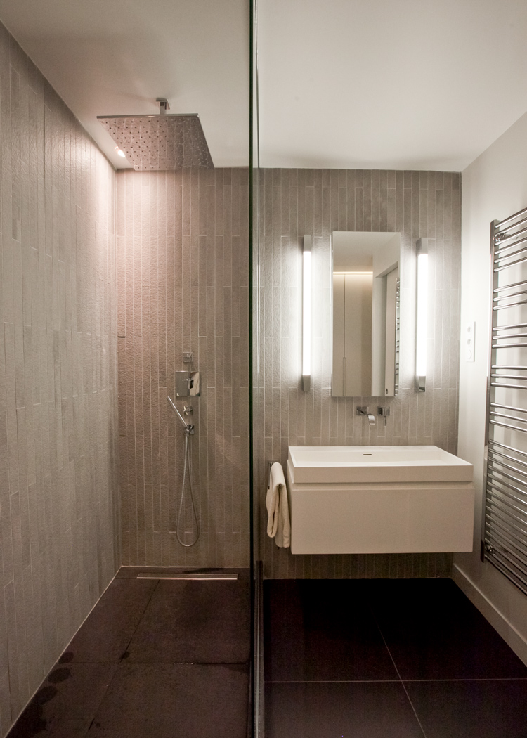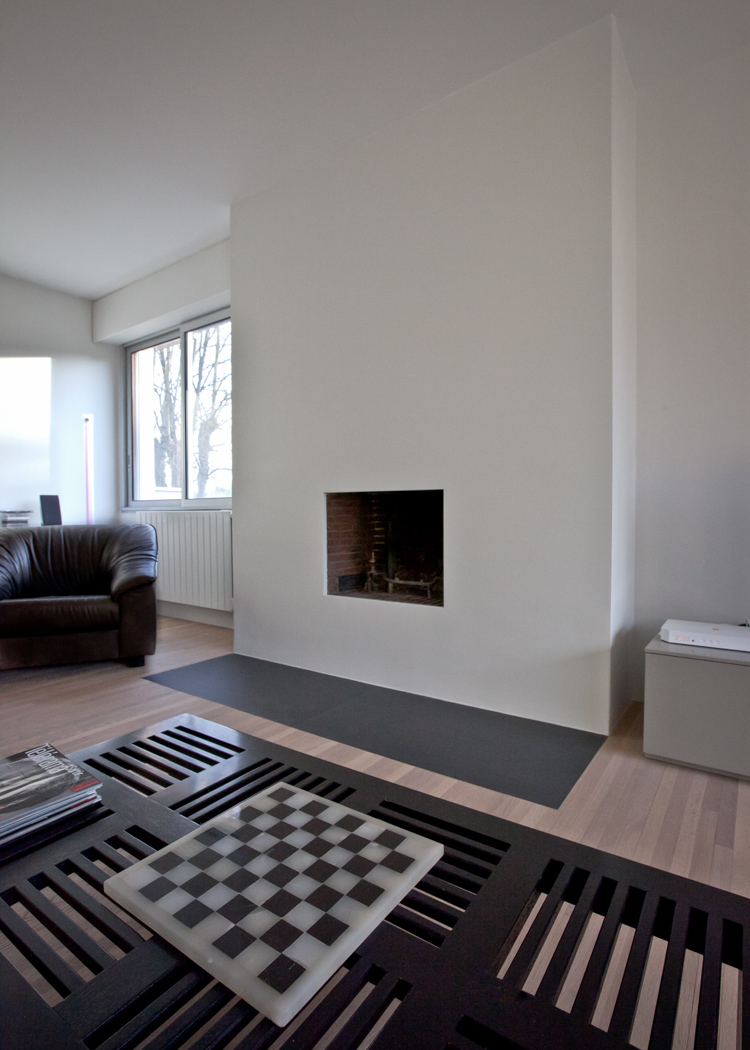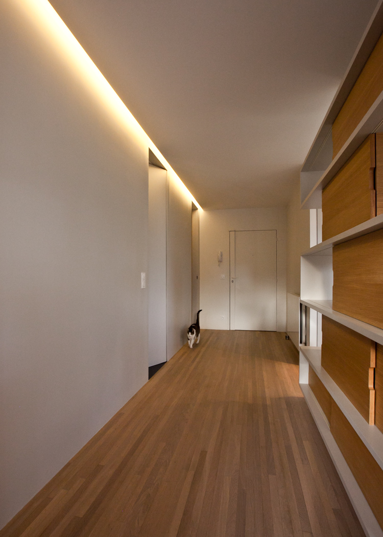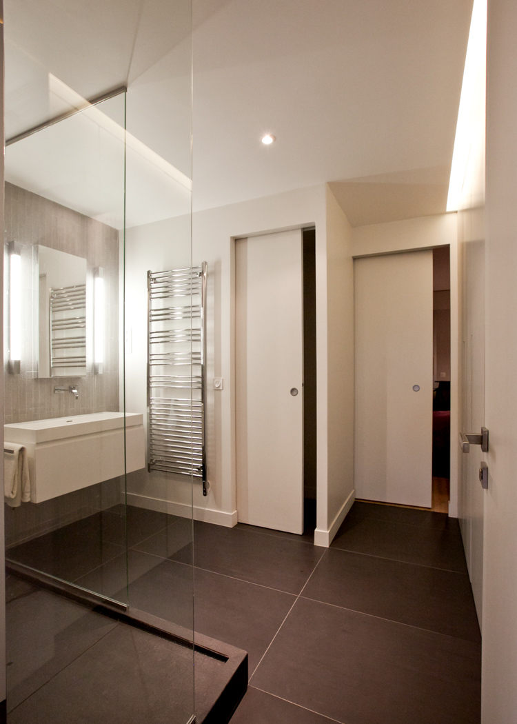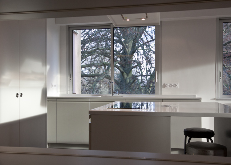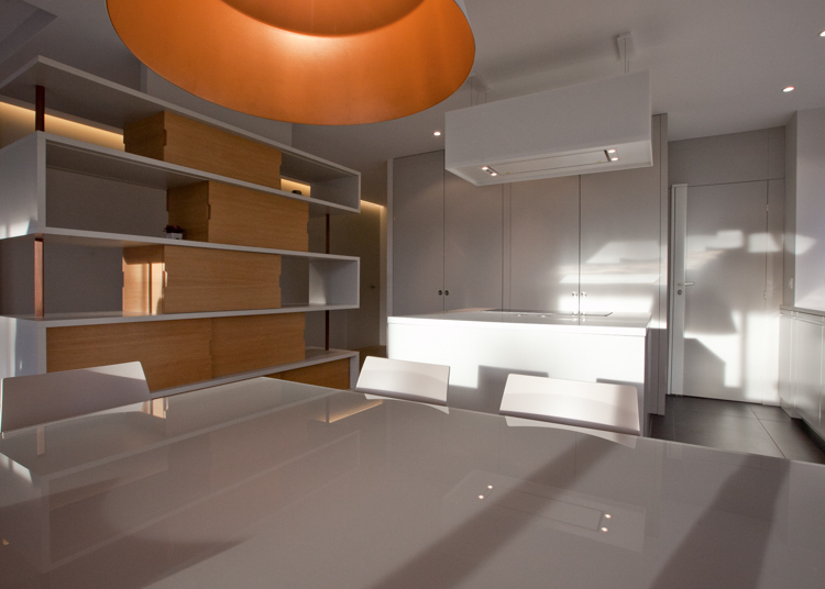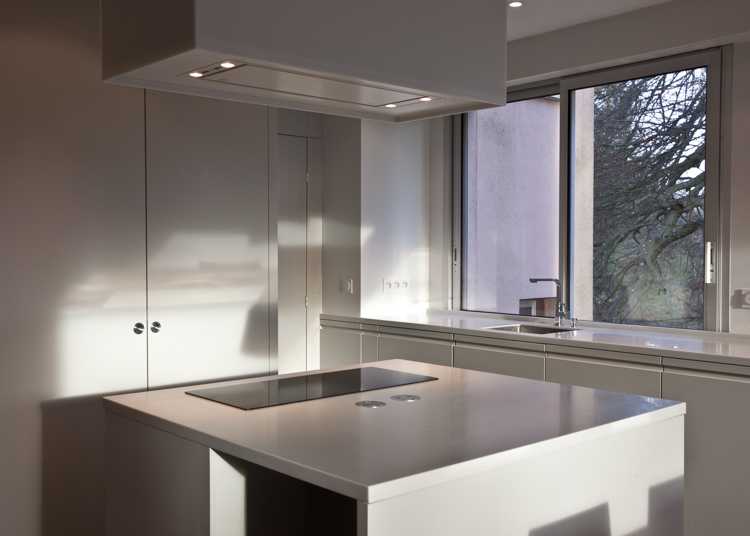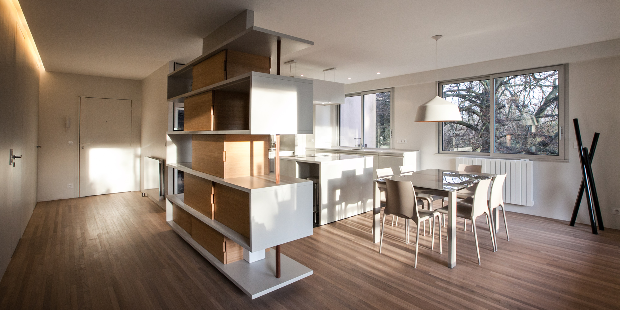 Réaménagement d’un appartement d’une surface de 130 m², situé dans une résidence récente à Louveciennes, en région parisienne. La démolition de nombreuses cloisons a permis de libérer les circulations et d’ouvrir les espaces de vie : l’entrée et la cuisine sont tout à la fois délimitées et réunies autour d’un meuble-paravent habillé de hêtre. Ajouré, ce dernier offre un jeu de pleins et de vides, filtre les vues, les ombres et les lumières, tout en proposant de nouveaux cadrages sur les arbres centenaires environnants. La cuisine, désormais ouverte sur la salle-à-manger, dispose d’un ilôt central et de plans de travail en corian. Au sol, dalles XXL en grès cérame et lames de chêne dessinent et délimitent les nouveaux espaces créés.