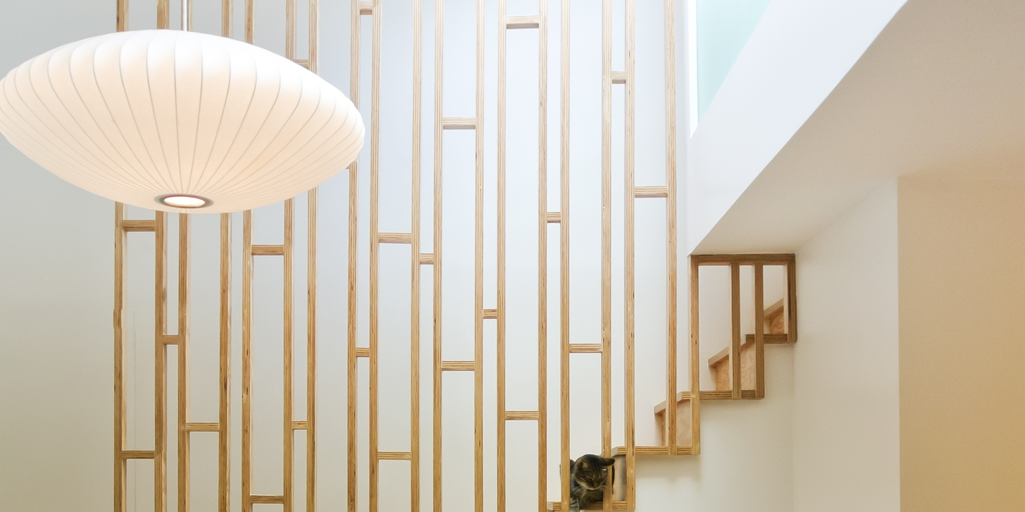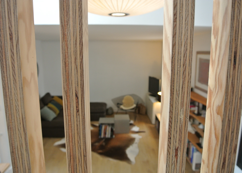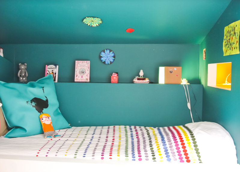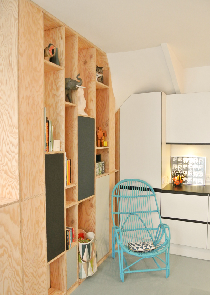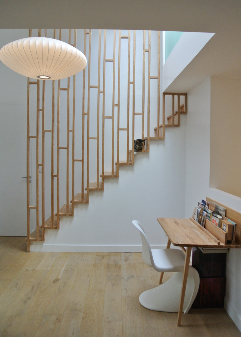 Transformation d’une maison sur cour de 72 m² pour une famille de 5 personnes, dans le 11ème ar. de Paris. La démolition intérieure du bâti et de sa toiture, associée à l’aménagement des combles, a permis la métamorphose de l’habitation et l’augmentation de sa surface habitable. En rdc, un vaste espace de vie (entrée- cuisine-salle-à-manger) a été composé. Une bibliothèque délimite l’entrée tout en dissimulant l’escalier. La cuisine et la salle-à-manger s’enveloppent mutuellement d’un muret bas en bâtipin au veinage organique. De nouveaux percements sur cour insuffle une nouvelle clarté à l’ensemble tout en préservant l’intimité intérieure. Au 1er étage, le séjour est sublimé par une double-hauteur. Une verrière de 4 m² y diffuse sa lumière naturelle. Sous un toit généreusement vitré, les combles accueillent désormais les chambres et la salle-de-bain des enfants. Dans la chambre des petites filles, 2 lits-cabanes se glissent sous les rampants : un lit-cabane bleu-canard, métaphore de la nuit versus lit-cabane jaune d’or, métaphore du jour.