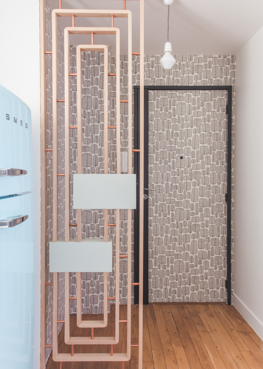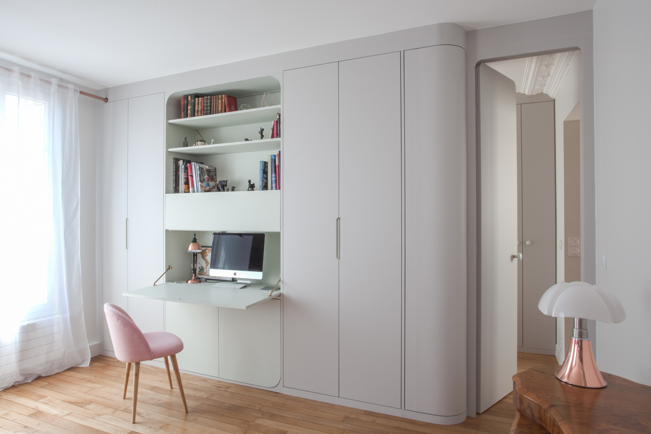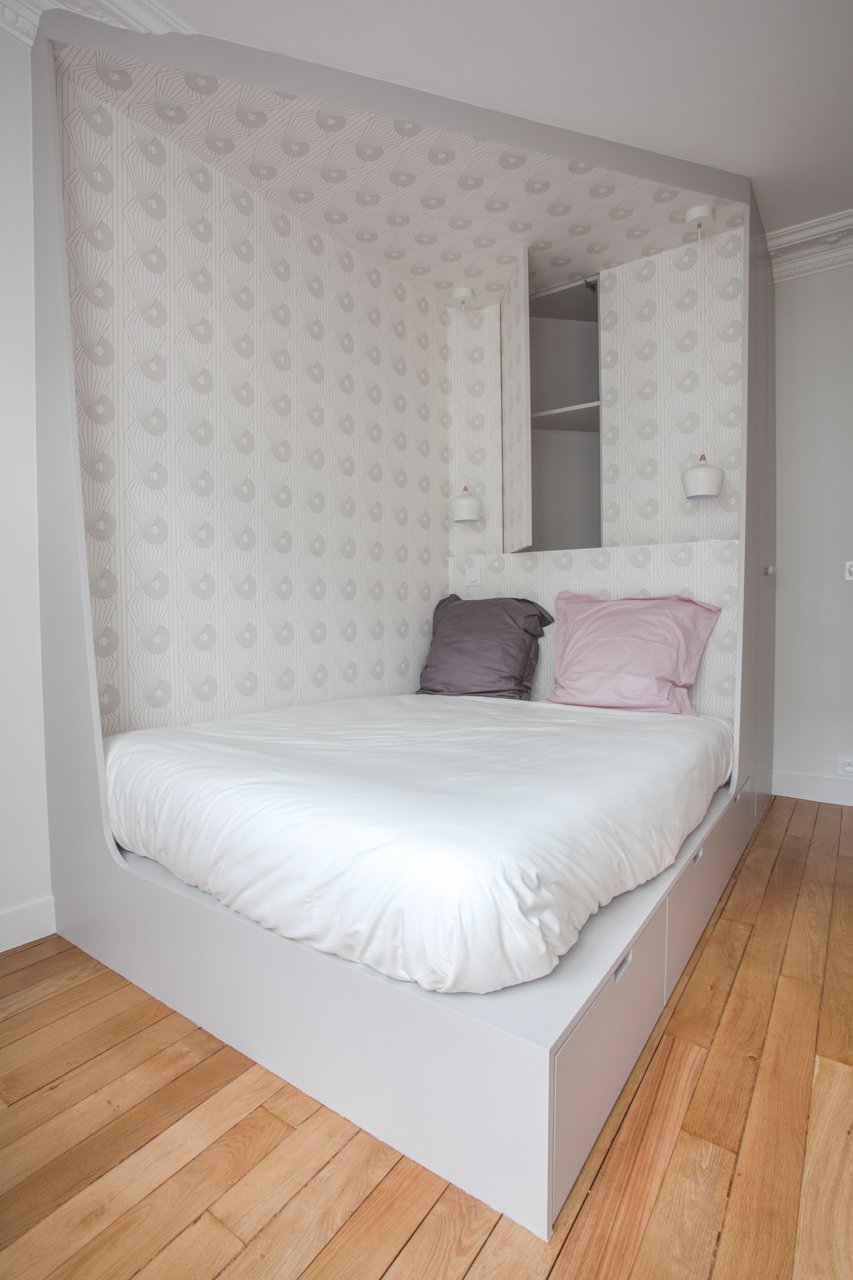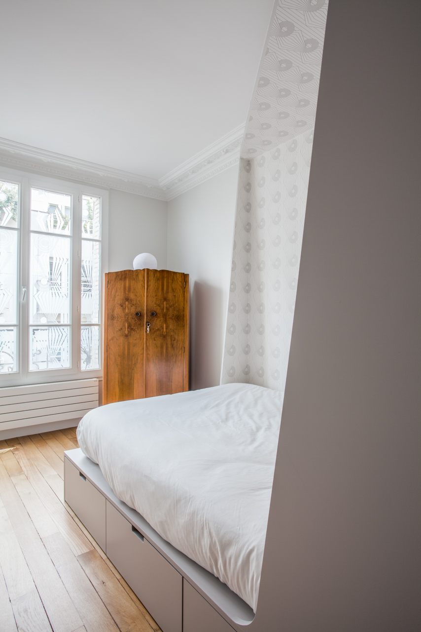 Réaménagement d’un appartement d’une surface de 50m² pour une personne célibataire. La suppression de la totalité des cloisons a permis la création d’un espace de vie central autour duquel le reste de l’appartement s’organise. L’ancien couloir a disparu. Un paravent ajouré sépare, sans isoler, l’entrée de la cuisine. Un grand meuble triple-faces, aux fonctions multiples (rangement / bureau / dressing), délimite discrètement le séjour de la chambre. Une « couchette » semi-ouverte et enveloppée de papier, y revisite le lit à baldaquin. La salle-de-bain attenante s’élargit au profit de nombreux rangements et d’une invisible lingerie.