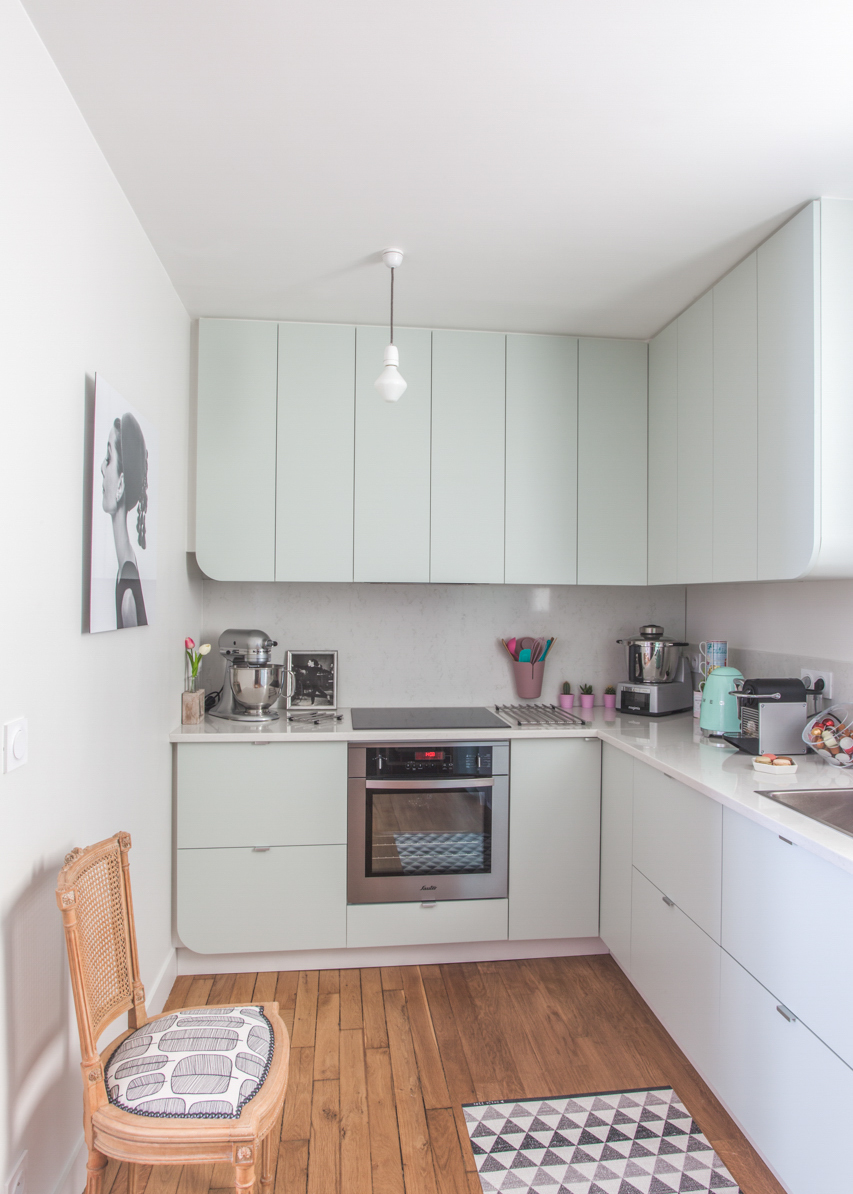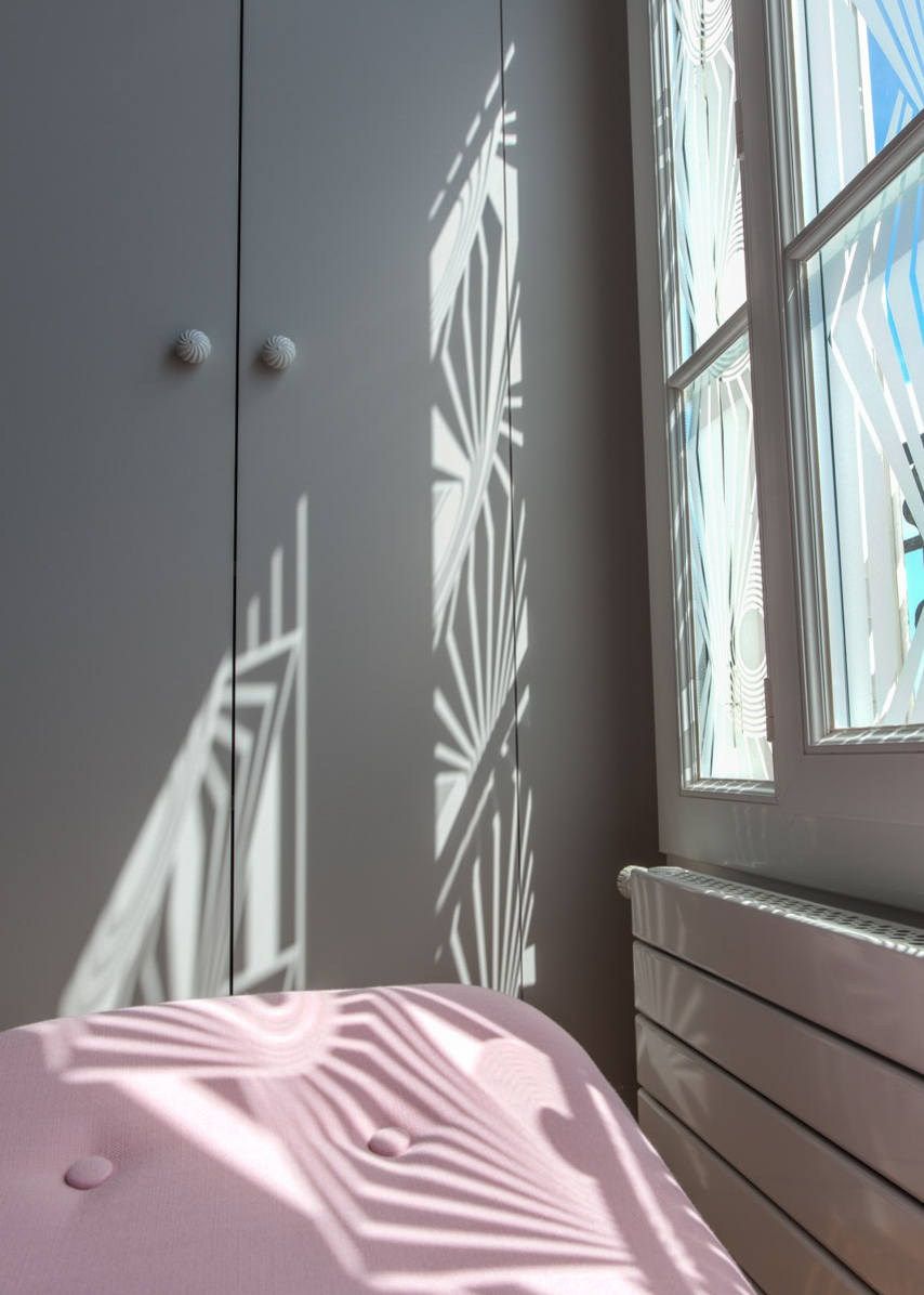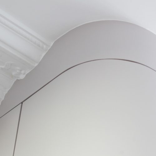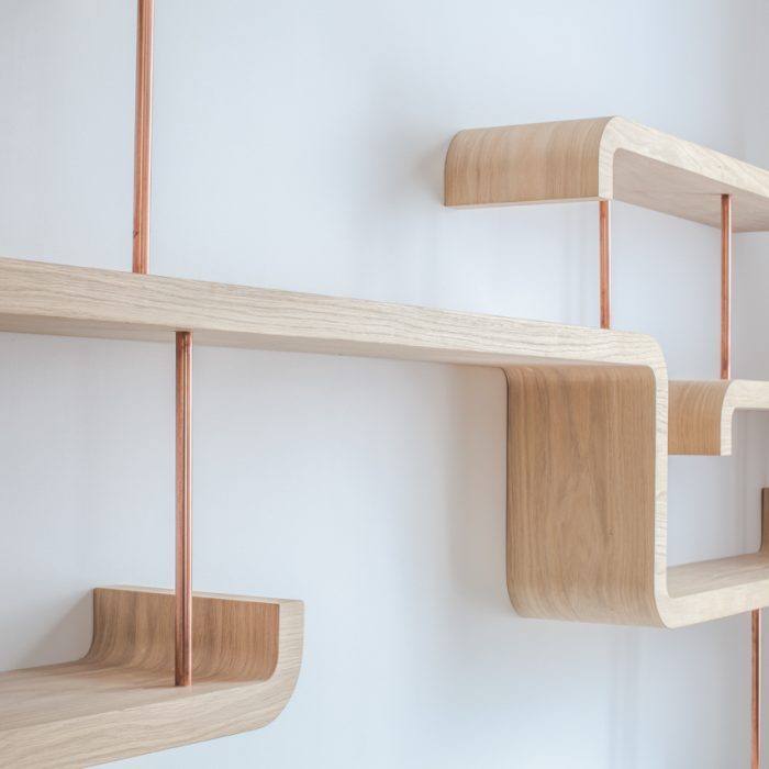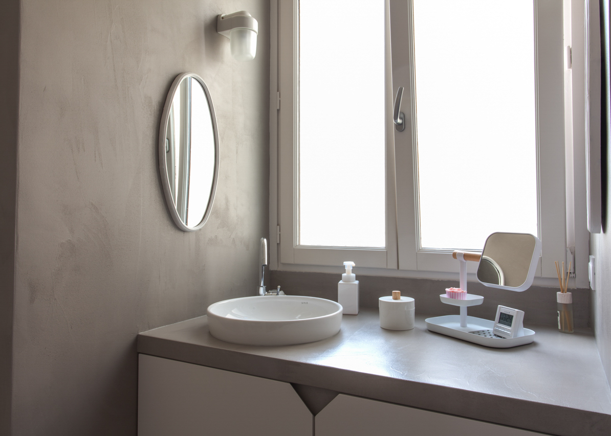 Réaménagement d’un appartement d’une surface de 50m² pour une personne célibataire. La suppression de la totalité des cloisons a permis la création d’un espace de vie central autour duquel le reste de l’appartement s’organise. L’ancien couloir a disparu. Un paravent ajouré sépare, sans isoler, l’entrée de la cuisine. Un grand meuble triple-faces, aux fonctions multiples (rangement / bureau / dressing), délimite discrètement le séjour de la chambre. Une « couchette » semi-ouverte et enveloppée de papier, y revisite le lit à baldaquin. La salle-de-bain attenante s’élargit au profit de nombreux rangements et d’une invisible lingerie.