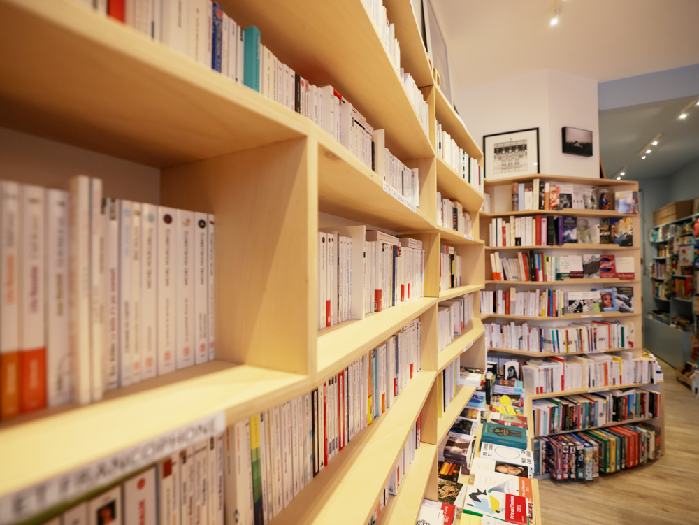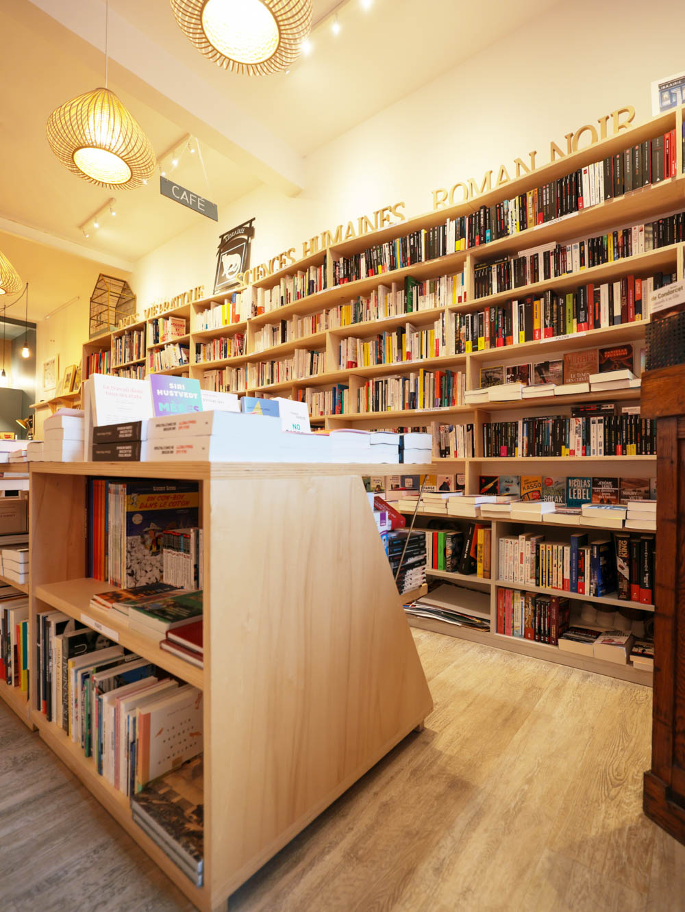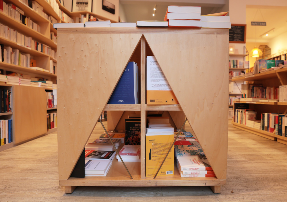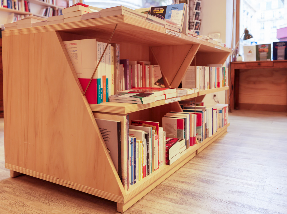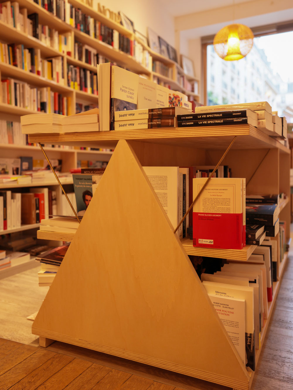 Rénovation complète et transformation d’une très ancienne librairie de 74 m² et à la belle hauteur sous-plafond, en une nouvelle librairie indépendante et généraliste ancrée au cœur du 15ème ar. à Paris. Au programme : offrir aux amoureux des livres ou aux simples flâneurs du quartier un nouvel espace lumineux, généreux et chaleureux. La nouvelle librairie propose désormais une fluidité et une circulation aisée entre 3 espaces distincts dédiés à la Littérature, aux Sciences Humaines, à l’Art et l’Histoire… pour le plus vaste, mais aussi à la littérature Jeunesse qui se love tout naturellement dans la douceur d’un « cocon bleu ciel » à part entière et enfin un espace café confortable et convivial tout à la fois lieu d’échanges et de rencontres littéraires mais aussi d’expositions multiples. Comme un voyage en perpétuel mouvement, le parti pris architectural de la librairie propose de nouvelles bibliothèques de bois clair, aux étagères uniques et multiformes, chacune ayant été dessinée différemment les unes des autres pour être fabriquée puis ciselée dans la matière… comme pour mieux nous surprendre et rappeler aux lecteurs le caractère unique, mystérieux et inattendu des livres. Les tables-présentoires en bois clair de peuplier rehaussées d’éclats de laiton dorées, sont placées au centre de la librairie. Elles exposent et véhiculent elles aussi leur singularité propre. Leur design aux formes géométriques et souvent inversées, arbore des compositions graphiques toujours différentes, tout comme les lettres de notre alphabet.