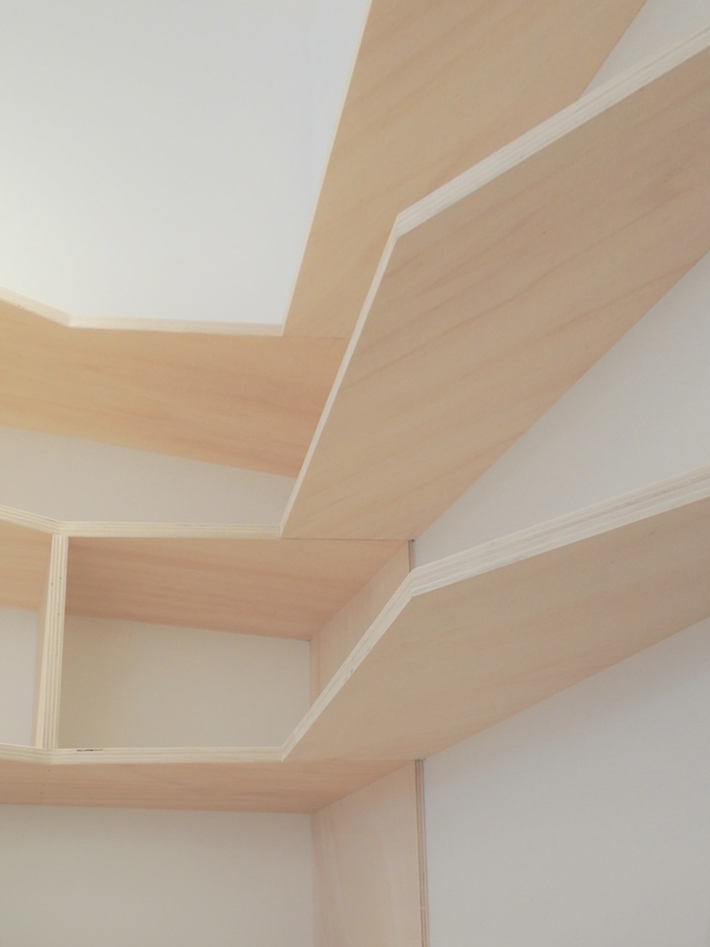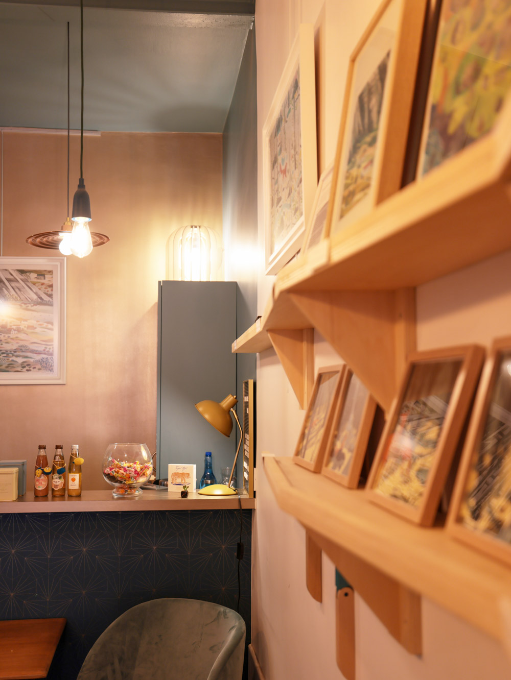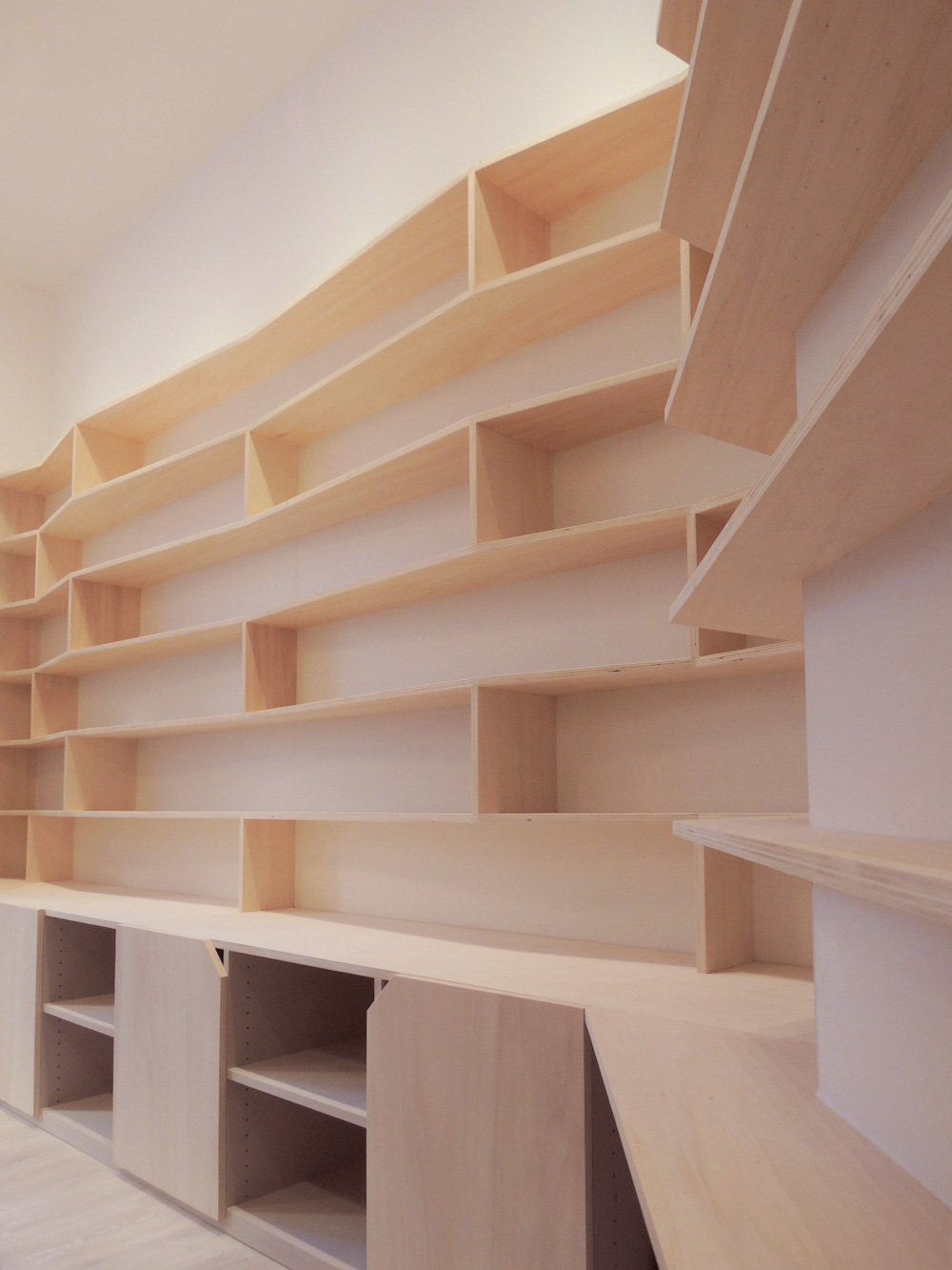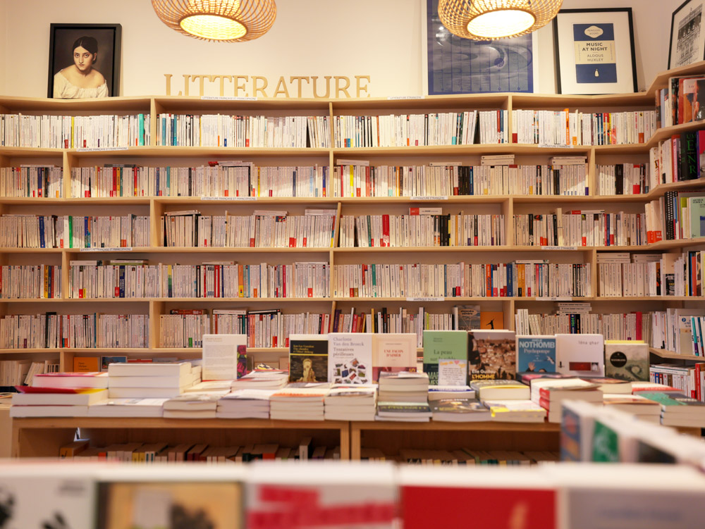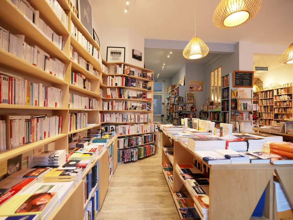 Rénovation complète et transformation d’une très ancienne librairie de 74 m² et à la belle hauteur sous-plafond, en une nouvelle librairie indépendante et généraliste ancrée au cœur du 15ème ar. à Paris. Au programme : offrir aux amoureux des livres ou aux simples flâneurs du quartier un nouvel espace lumineux, généreux et chaleureux. La nouvelle librairie propose désormais une fluidité et une circulation aisée entre 3 espaces distincts dédiés à la Littérature, aux Sciences Humaines, à l’Art et l’Histoire… pour le plus vaste, mais aussi à la littérature Jeunesse qui se love tout naturellement dans la douceur d’un « cocon bleu ciel » à part entière et enfin un espace café confortable et convivial tout à la fois lieu d’échanges et de rencontres littéraires mais aussi d’expositions multiples. Comme un voyage en perpétuel mouvement, le parti pris architectural de la librairie propose de nouvelles bibliothèques de bois clair, aux étagères uniques et multiformes, chacune ayant été dessinée différemment les unes des autres pour être fabriquée puis ciselée dans la matière… comme pour mieux nous surprendre et rappeler aux lecteurs le caractère unique, mystérieux et inattendu des livres. Les tables-présentoires en bois clair de peuplier rehaussées d’éclats de laiton dorées, sont placées au centre de la librairie. Elles exposent et véhiculent elles aussi leur singularité propre. Leur design aux formes géométriques et souvent inversées, arbore des compositions graphiques toujours différentes, tout comme les lettres de notre alphabet.
