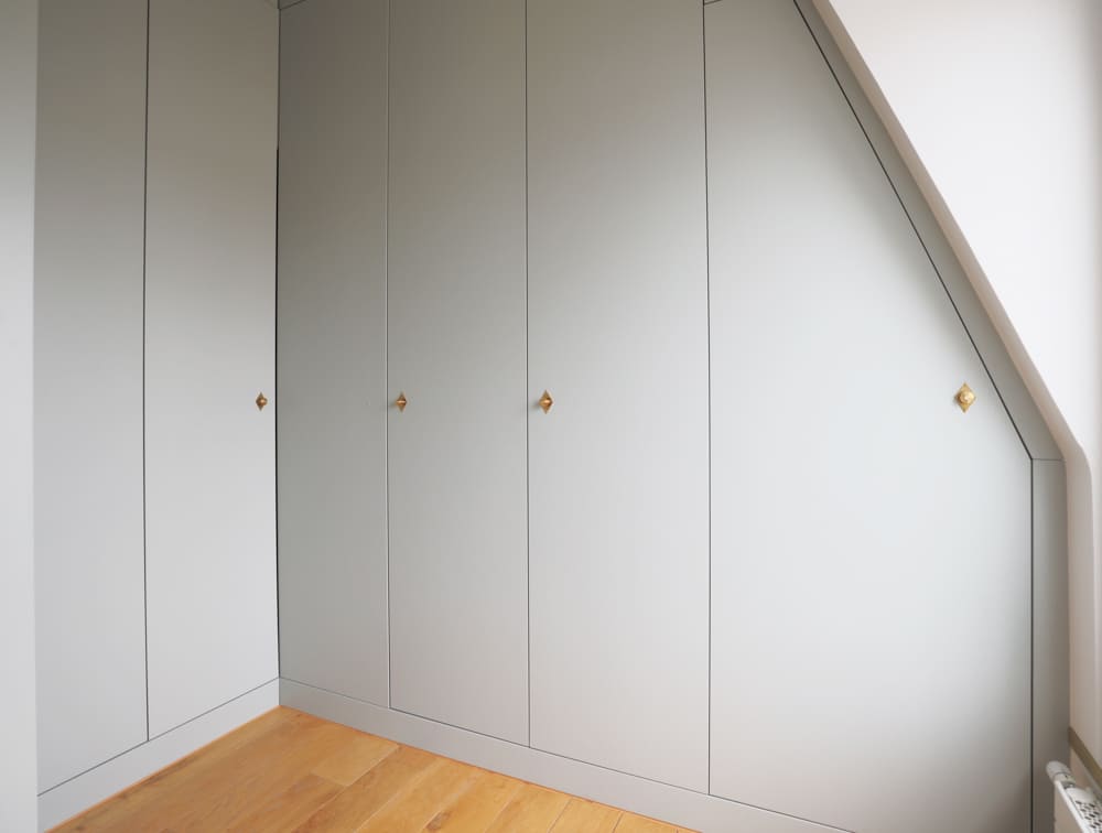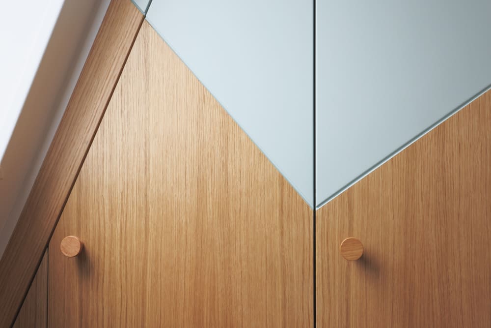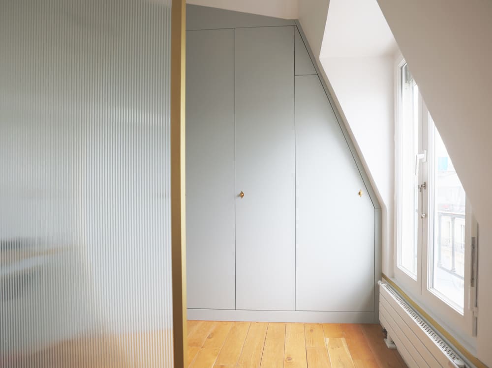 Réaménagement partiel d’un grand appartement familial en duplex situé aux derniers étages d’un immeuble hausmannien du 9ème ar. L’étage sous les toits typique des combles mansardés parisiens (avec son enfilade originelle de petites pièces…) décline 3 grandes chambres déjà réunies mais présentant des proportions hétérogènes et peu équilibrées. L’enjeu du projet de l’étage se tourne alors vers la création de 4 chambres (et non plus 3) spacialement bien équilibrées et dotées de véritables rangements intégrés : les coins et recoins les plus insoupçonnables des chambres sous rampants, se muent alors en rangements sur mesure à foison. L’ameublement insuffle alors à chaque chambre une singularité stylistique clairement assumée : la chambre parentale s’offre un nouveau dressing épuré et de couleur tendre twisté par une envolée d’oiseaux en tête de lit et soulignée de lisérés dorés, la chambre de la petite fille s’offre de nouveaux horizons paysagers et des arches de bouleau à ses façades de dressing rose poudré…
