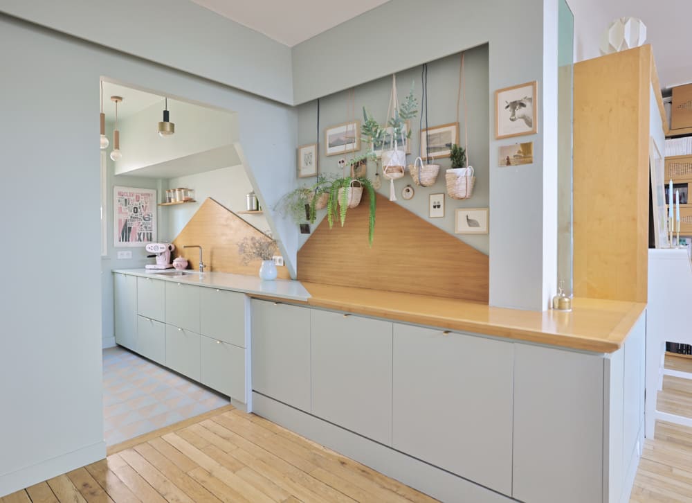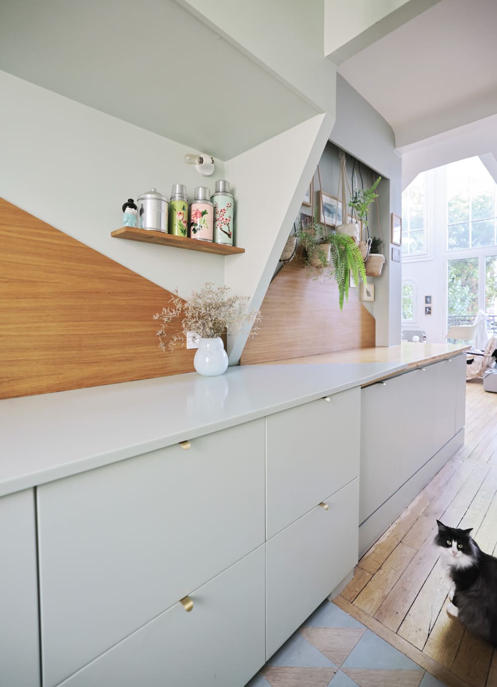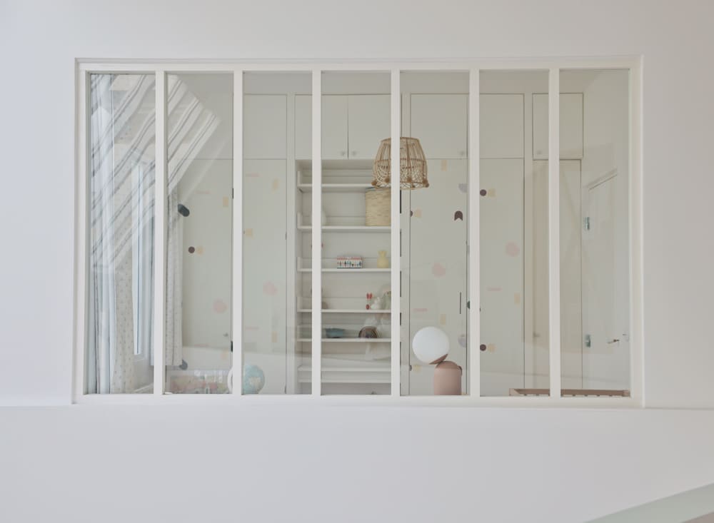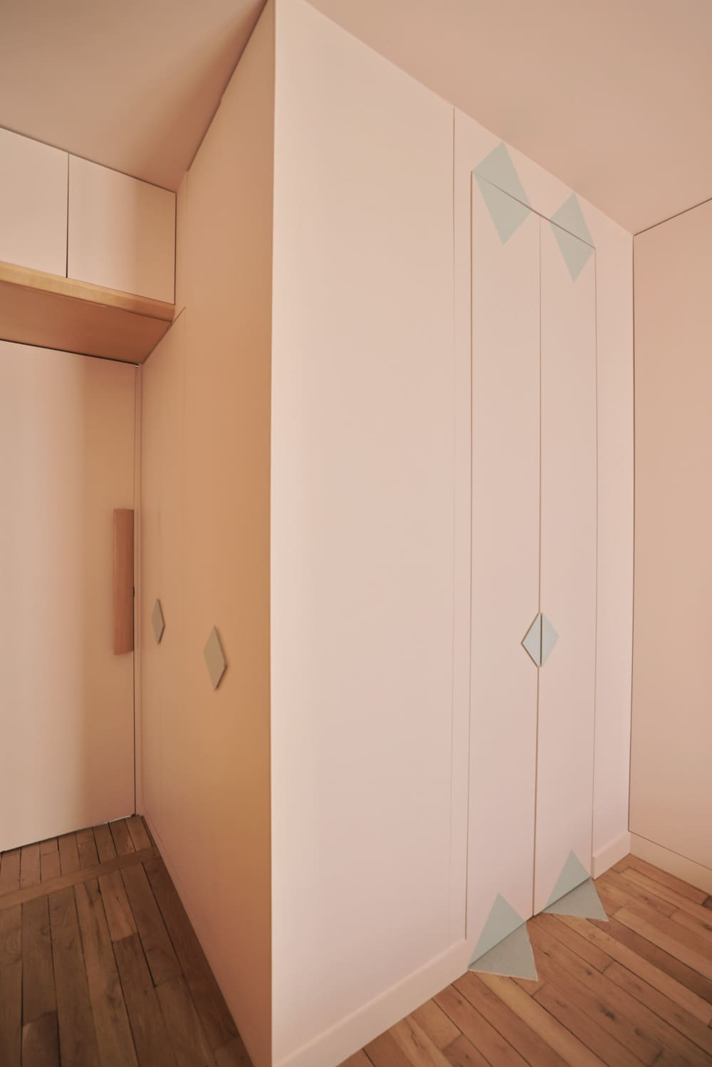 Rénovation complète d’un ancien atelier d’artiste parisien en duplex situé au cœur du 14ème ar. de Paris. Conçu par l’architecte Paul Schroeder en 1912, cet ancien atelier niché aux 2 derniers étages de l’immeuble, bénéficie d’un charme fou : son espace de vie central à l’exceptionnelle hauteur sous plafond (6m) est baigné d’une lumière zénithale constante et homogène. Les verrières du Nord plongent ses habitants dans un ciel en perpétuel mouvement mais aussi dans les feuillages des 2 grands peupliers de la cour intérieure. Au cœur de l’appartement, les espaces de vie sont ouverts les uns aux autres tout en proposant des agencements sur mesure aux multiples rangements. Le plan de travail en corian de la cuisine vient à la rencontre d’un plan en bois tel un puzzle. Une bibliothèque en chêne semi-ajourée par des panneaux coulissants en cannage joue du motif triangulaire et oblique flottants juste au-dessus par la présence d’une mezzanine au plan triangulaire. La chambre parentale redistribue son dressing tout en lui intégrant une nouvelle et invisible salle d’eau. A l’étage, telle une maison perchée, les chambres des enfants se répartissent côté Sud et côté Nord, exploitant ainsi une 2de mezzanine largement vitrée pour y accueillir le dernier né de la famille agrandie. Le projet devient ainsi une formidable occasion d’offrir à ces lieux chargés d’histoire un nouveau bain de jouvence.